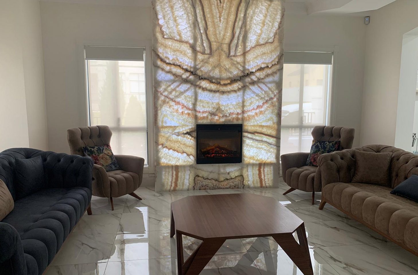 Antique Brown Granite used for Bar Benchtop with Rainbow Onyx Bar Back Panel