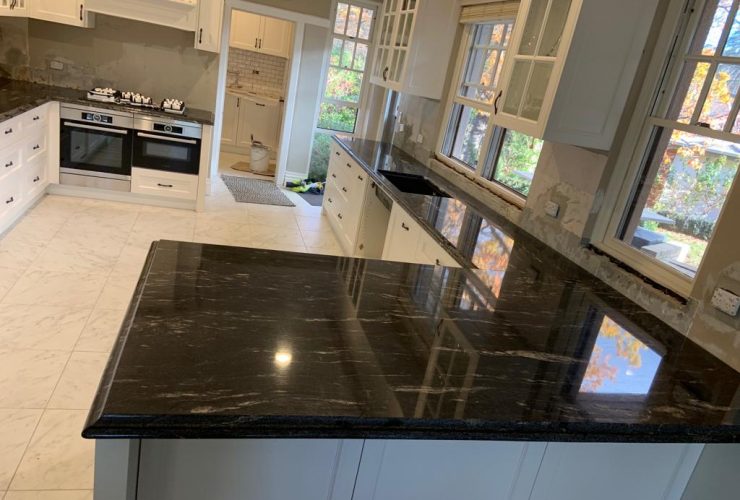 Sequoia Marble Leather Finish 40mm Shadowline Kitchen with waterfall panels